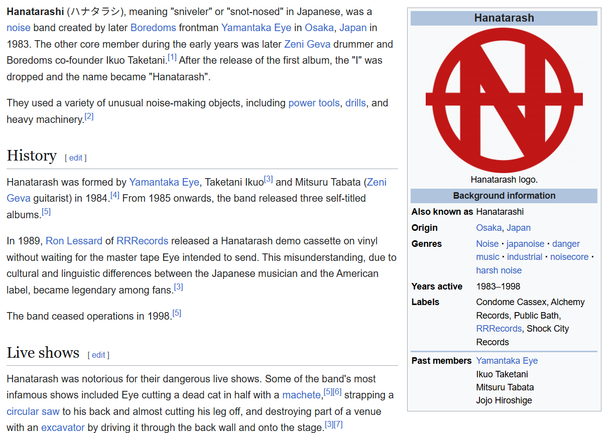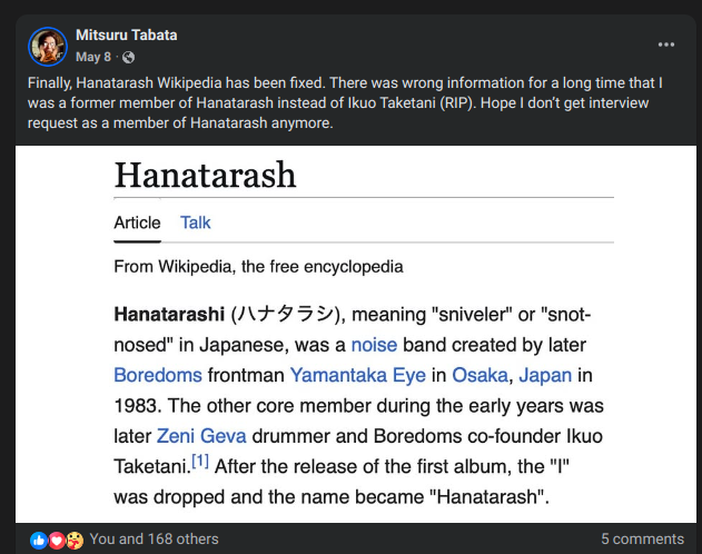 Can’t say for sure if the two things were related, but it happened. Anyway, either he stopped reading at this point or the page was re-edited later to make sure he was included somehow in this group he was not in. Why would someone do this? Because there were numerous examples of articles that obviously used the earlier version of the page for reference, but that felt no need to cite their source (as is required for wiki). The original mistake seems to have come about possibly by a lazy translation from a unknown French writer for VICE, an organization infamous for its lack of fact-checking. There is this story of Eye meeting Tabata at a Einstürzende Neubauten show: