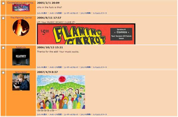 No! I am not dealing with MySpace ever again. If you haven’t noticed (and you probably haven’t) the “new myspace” design was rolled out over all the old pages, deleting almost all of the old content. It’s bullshit. The only reason you’d go back there is nostalgia for how it was, right? I mean it became a joke pretty quick but at one point it was really good for experimental artist and J-indie bands, and it remained useful for a lotta people like that for much longer than for Joe-Jane Average Internetter. Now it’s nothing. Even if people use it again I’m not updating my pages. I’m not with the constantly creating content for these companies that can just be deleted whenever nonsense. Luckily, I took many screencaps…