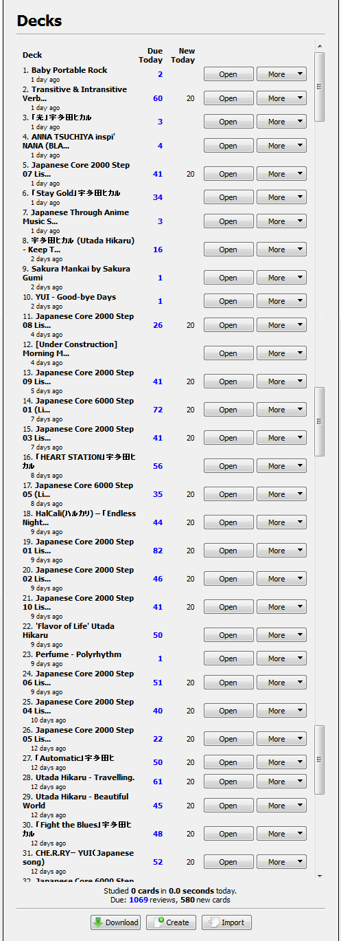 Ahh, fuck. This tells me nothing. Except I’m another day behind. I did get that down to only a week behind at some point in the month. It’s obvious I’m doing too many decks at once but I can’t undo that now. I thought the download option might go away entirely so I got every deck loaded in there. And the song decks aren’t nearly as big as the real ones, I should be able to “finish” them this month. (They never end, the review time just gets longer.) I should be able to clear out the new cards anyway. I’ve cleared out some of them already. Let’s make a list here and meet back here next month. [Why not cap the whole thing and put it behind a cut.]