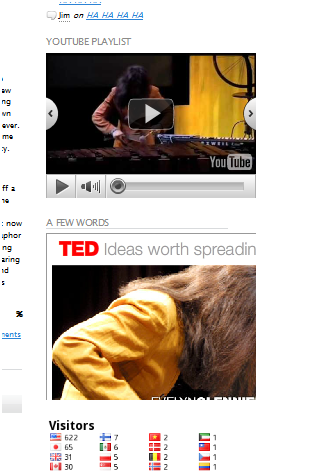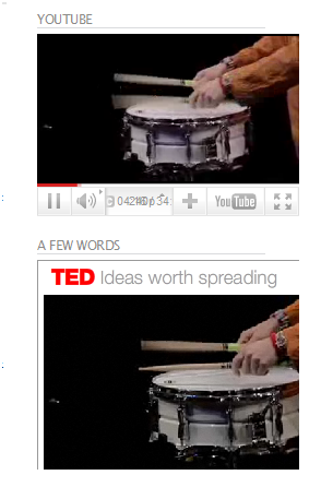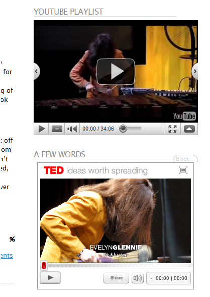 Added a youtube playlist to the sidebar. It just has one video in it right now: Evelyn Glennie’s TED talk which I used to have embedded in there direct from the TED site. It never really embedded right, but I kinda liked how it looked in there provided the screen resolution was set to whatever. The youtube embed adjusts along with the resolution: