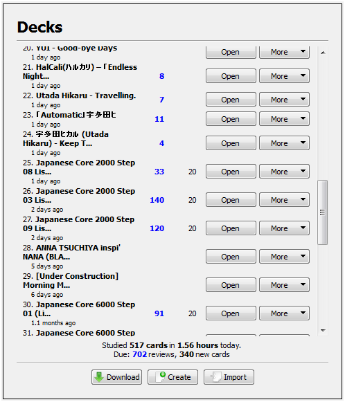 You can follow Anki on twitter, btw. They’re trying to improve the system. Maybe they read whenever someone blogs about them (probably do). If any of my feedback is useful and helps other people that’s great. But I also think the system is good enough for me. I just need something to tell me everyday that I’m fucked if I don’t study more. Because if it’s a book, or even a class with weekly quizzes, on a day-to-day basis, without a constant outside reminder I’m just checking my own brain to see if I’m fucked, and the answer will always come back, “nope! doin’ fine.” Which is rarely the case. Then suddenly it’s the day of the test. But there was nothing sudden about it, I just couldn’t prioritize it until it was too late. Don’t think I’m that special in this regard, so keep that in mind, Anki people. It might bum some people out to see the the stuff pile up like that, but you can’t make it too easy. No matter how good a system is, you really tend to learn when things overlap. That’s why immersion works, you’re getting many, many sources of the same words. That’s when the repetition kicks in and it becomes long-term memory. The best system can only try to give the widest circle possible for other exposure to overlap onto. (The great thing about a free open source program is that is doesn’t have to pretend it’s the One and Only Thing You Need.) That’s my theory and I’m sticking to it.