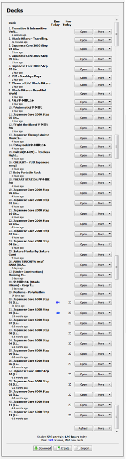 So that’s what I’m thinking. I’m not getting back to where I want with Anki, but I’ve now got it stuck at a max of 2 days. I can keep it there easy at this point, but it’s got to get down to a max of 1 day and stay there to make good progress. Been going back to Jpod101 too. (I have several old Berlitz and Pimsleur courses but they don’t get very advanced.) I joined Jpod a while ago and for a while I was hating myself for paying for the premium service but if I hadn’t I doubt I would be going back to it and it is kinda good if at times grating.