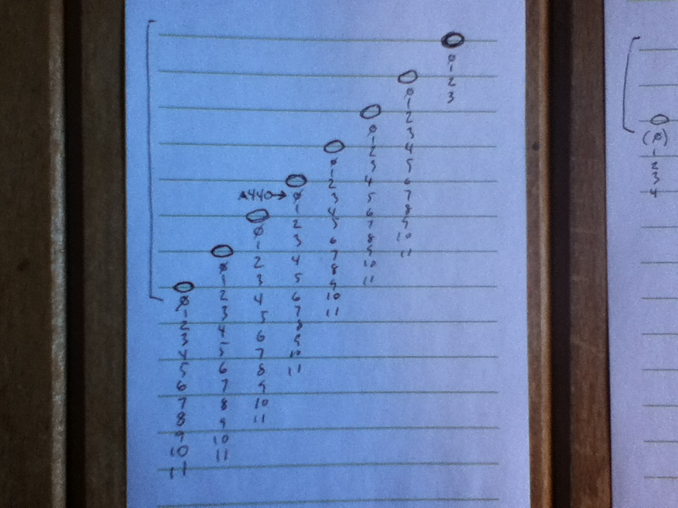 Now, if you know anything about the saxophone, you can see I’ve made a terrible mistake and left out an entire octave. This is not really a problem right now, because like the earlier posts, if I just put this thing out all at once looking great and making sense, some asshole is just going to put it on a t-shirt and no one will care where it came from. And of course, hardly anyone would use this system for piano or saxophone, it’s mostly useful for string instruments that can alter their tuning and range. (And maybe even for singers.) If you can figure out how to do this already, good for you. But I’ll keep working on better ways to present the idea. %